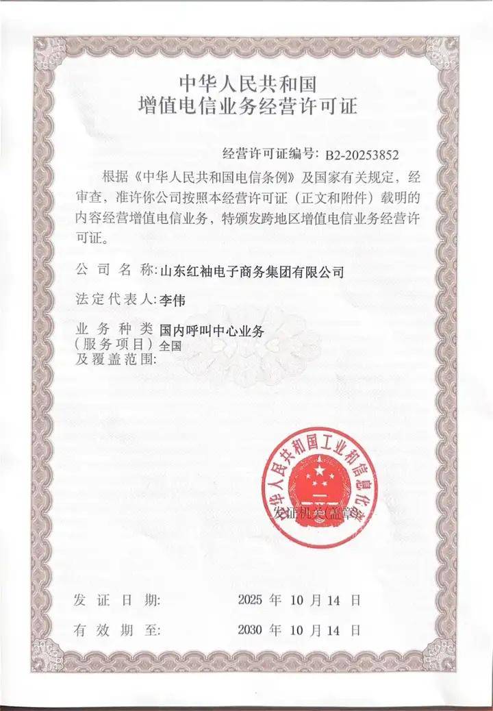 红袖集团已正式获得增值电信业务经营许可证。该资质是企业在相关领域合规经营、专业服务的重要准入证明,标志着集团在电信与信息服务方面的规范性与专业性获得国家认可。