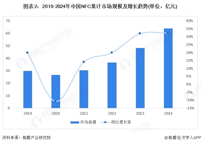 2019-2024年中国NFC果汁市场规模从30亿元增至预测的64亿元,期间经历2020年疫情冲击后的短暂下滑,随后持续复苏并加速增长,整体呈强劲发展态势。