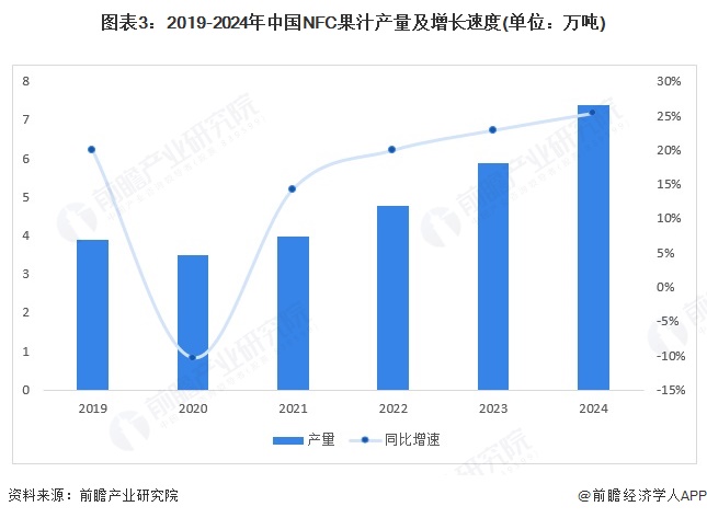 中国NFC果汁市场供给能力随产量增长持续增强,2019-2024年产量从3.9万吨增至7.4万吨,头部企业规模化生产降本增效,代工厂提供产能支撑,小众口味、功能性产品丰富供给,冷链物流保障供应效率,供给体系不断完善。