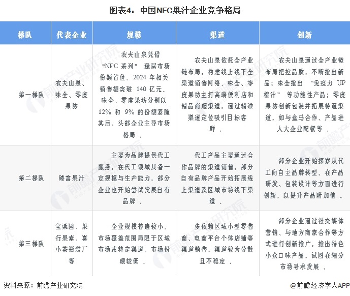 NFC果汁市场竞争格局呈现梯队化特征,第一梯队以农夫山泉、味全为代表,凭借全产业链布局和广泛渠道占据主导地位;第二梯队包括零度果坊、臻富等,聚焦中高端细分市场形成差异化优势;第三梯队则由宝桑园、果行果素等新兴及区域品牌构成,通过创新营销或特色原料抢占细分赛道,整体呈现头部引领、腰部追赶、新锐突围的多元竞争态势。